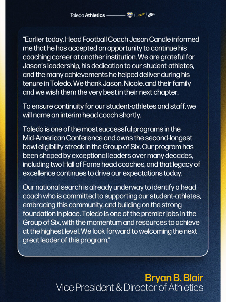 UT athletic director Bryan Blair confirmed Candle’s departure Saturday, thanking him for his leadership and noting that an interim coach will be named soon. Blair said the national search for Toledo’s next head coach is already underway.